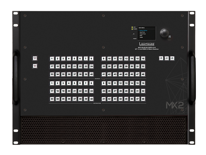 The Lightware product MX2-48×48-DH-24DPio-A-R belongs to the category of Full 4K DP 1.2 and HDMI 2.0 matrix