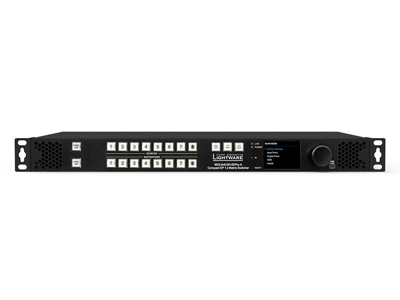 The Lightware product MX2-8×8-DH-8DPio-A belongs to the category of Full 4K DP 1.2 and HDMI 2.0 matrix